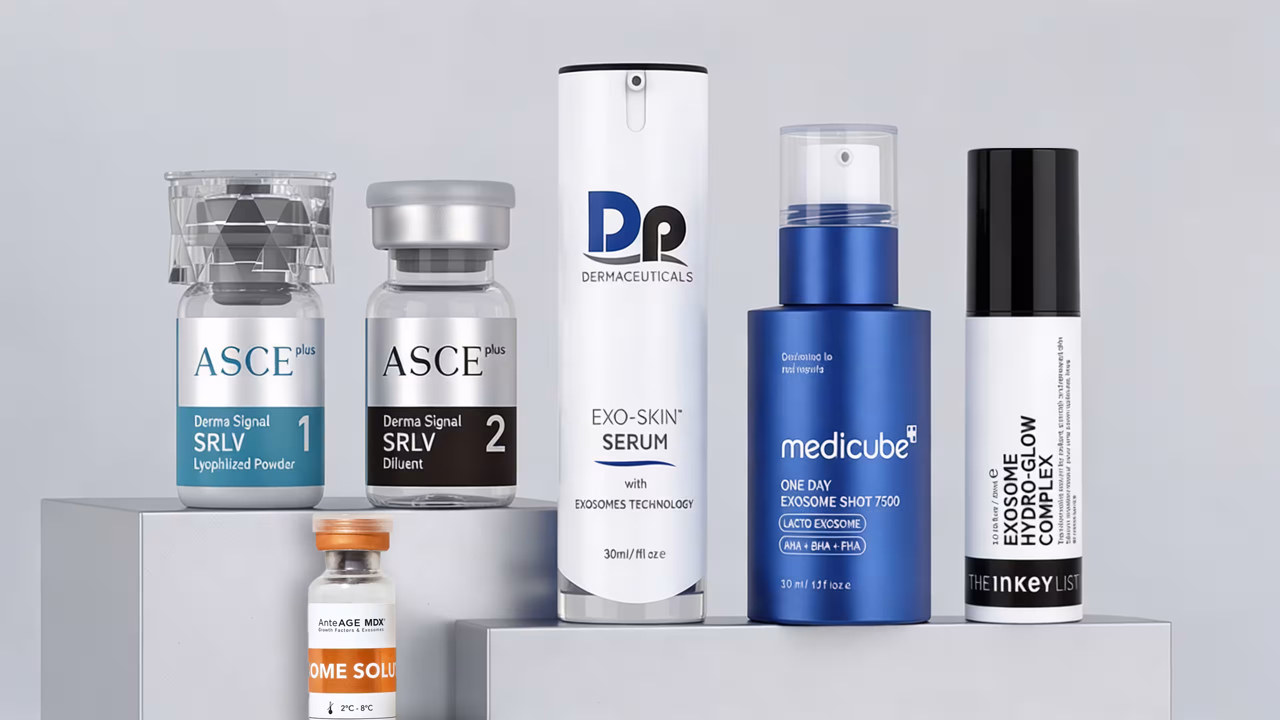 We picked five: two budget serums (~€19), one premium serum (~€150), and two clinic treatments. For each one, we checked the full ingredient list against the manufacturer's own sources, and asked three simple questions: Does it actually contain exosomes? What's really doing the work? And is the price fair?